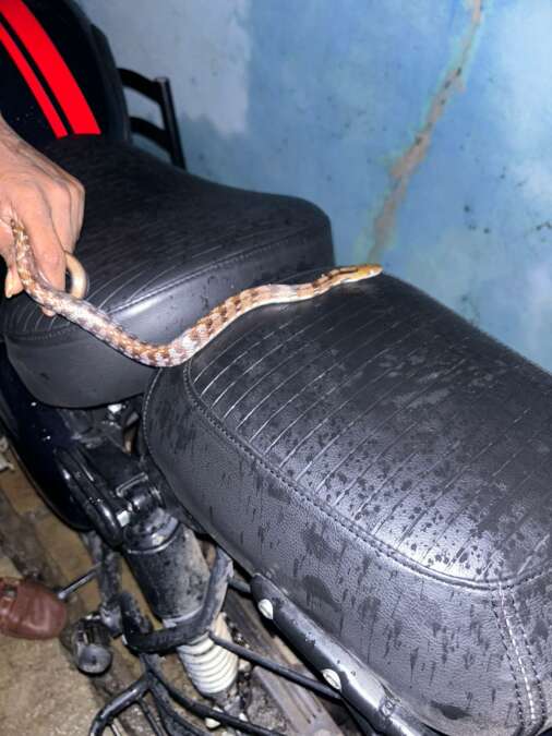 उत्तर सोलापूरातील कारंबा येथे रात्री १०:३० ची वेळ, मुसळधार पाऊस सुरु असताना… तेथील राहणार सागर काळे यांच्या दारात त्यांनी लावलेल्या बुलेट दुचाकी कडे त्यांची नजर गेली असता त्या गाडी मध्ये एक सर्प शिरत असल्याचे त्यांच्या निदर्शनास आले. त्यांनी तात्काळ सर्पमित्र सुरज बनसोडे यांना फोन कॉल द्वारे या घटनेची खबर दिली.
